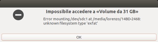 Questo errore si verifica perché il filesystem exFAT è di proprietà di Microsoft e i driver per gestirlo non sono inclusi di default all'interno dell'installazione di Ubuntu.